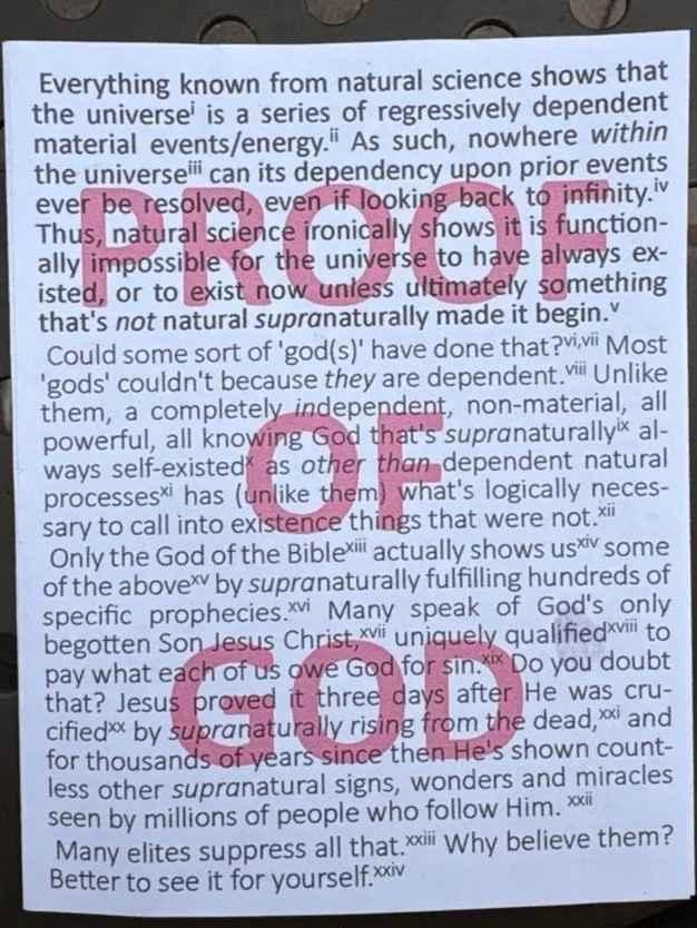 Someone recently handed me the following pamphlet that “scientifically proved the existence of God”: